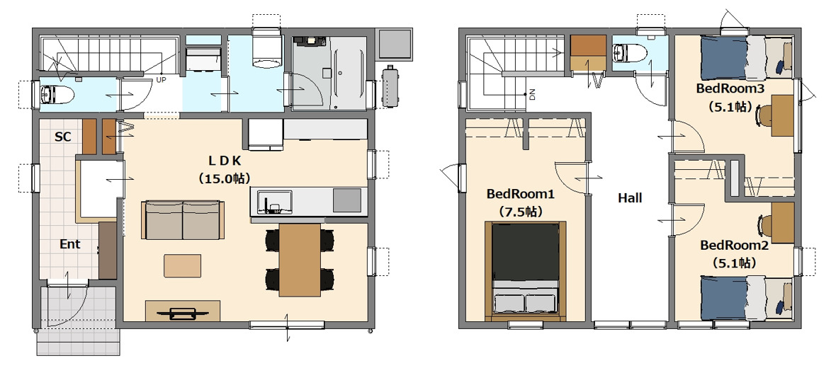 LDK15.0畳(1階) 洋室7.5畳(2階) 洋室5.1畳(2階) 洋室5.1畳(2階) |
