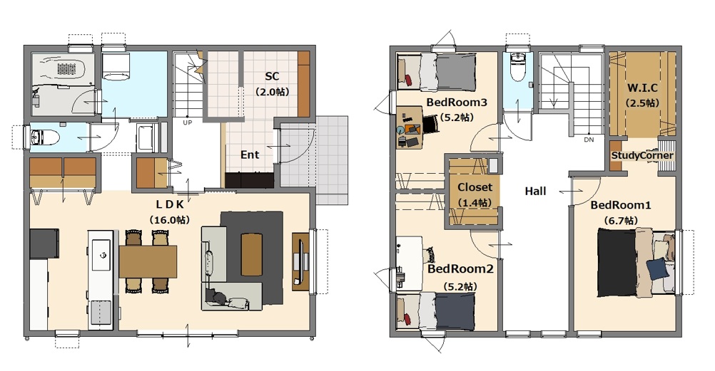 LDK16.0畳(1階) 洋室6.7畳(2階) 洋室5.2畳(2階) 洋室5.2畳(2階) |