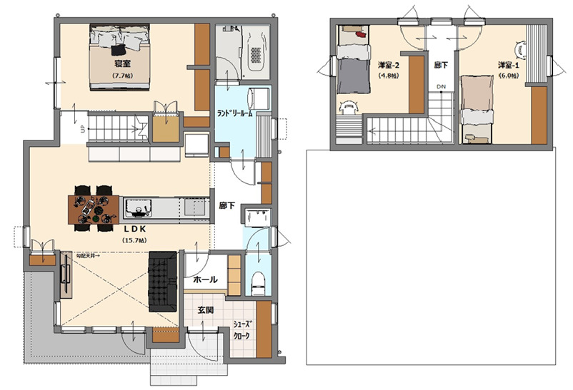 LDK15.7畳(1階) 洋室7.7畳(1階) 洋室6.0畳(2階) 洋室4.8畳(2階) |