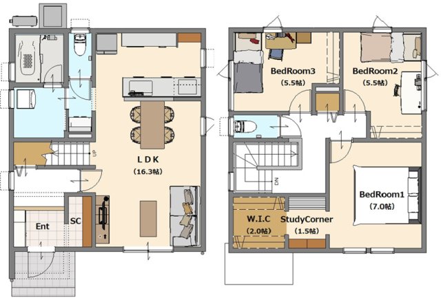 LDK16.3畳(1階) 洋室7.0畳(2階) 洋室5.5畳(2階) 洋室5.5畳(2階) |